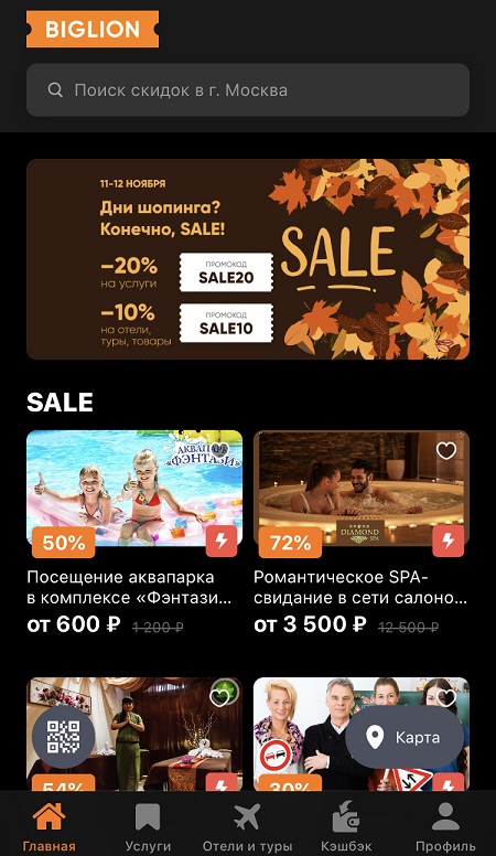 Сообщается, что включение «темной темы» полностью меняет интерфейс приложения «Биглион» — происходит затемнений уведомлений, фона и карточек всех акций. При этом вернуть привычный внешний вид можно очень легко в любой момент времени. Воспользоваться «темной темой» будет интересно всем пользователям приложения, — полагают разработчики приложения купонного сервиса «Биглион».