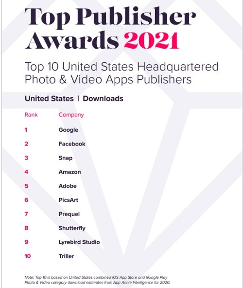 Аналитическая компания App Annie опубликовала рейтинг издателей мобильных приложений Level Up Top Publishers Awards 2021. В нём перечислены самые успешные с точки зрения доходов и скачиваний компании, выпускающие приложения для iOS и Android. Седьмое место в топ 10 издателей фото-/видео-приложений в США заняла компания Prequel