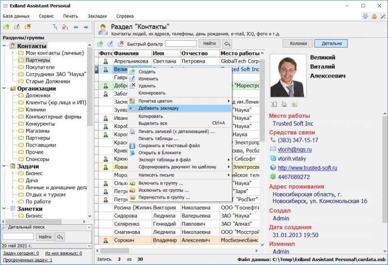 Простой, но мощный органайзер Exiland Assistant ежедневно используют множество пользователей как на работе, так и дома. Он предназначена для хранения контактов клиентов, партнеров, поставщиков, должников и т.п. и работы с ними, а также для ведения личных контактов, планирования звонков, встреч, событий, задач по проектам, хранения заметок, ссылок, паролей и многого другого. Спектр применения данной программы весьма широк, независимо от сферы деятельности.