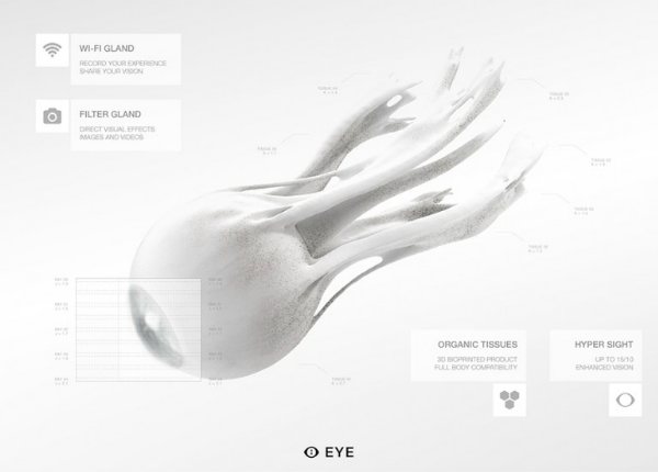 По прогнозам дизайнеров Mhox, наличие синтетического глаза сможет осуществиться к 2027 году, обеспечивая захватывающее представление о будущей человеческой “оптимизации”, которая может пойти далеко за пределы традиционного лечения, заменяя глазные яблоки для обеспечения хорошего зрения и предоставляя прямой доступ к сети Интернет от самого мозга.