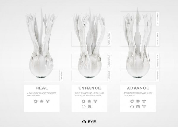 Проект Enhance Your Eye (EYE) предполагает, что при ухудшении зрения люди не будут нуждаться в ношении очков или линз, а просто поменяют свои глаза на новые, которые имеют три основных вида.