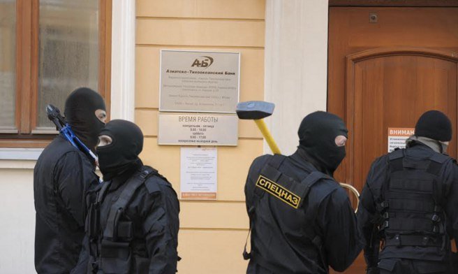 По данным российских СМИ, ссылающихся на информацию в соцсетях, во вторник, 12 апреля у московского офиса Азиатско-Тихоокеанского банка снова появились бойцы спецподразделения и у некоторых из них в руках находятся огромные кувалды и специальные клещи.